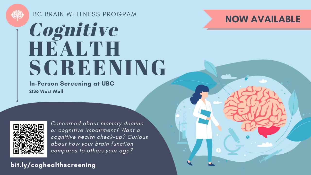 Concerned about memory decline or cognitive impairment? Want a cognitive health check-up? Curious how your brain function compares to others your age? The UBC Department of Neuropsychology in conjunction with the BC Brain Wellness Program will be offering in-person cognitive health screening at UBC this summer. There are limited appointments available, so please register by March 31st.