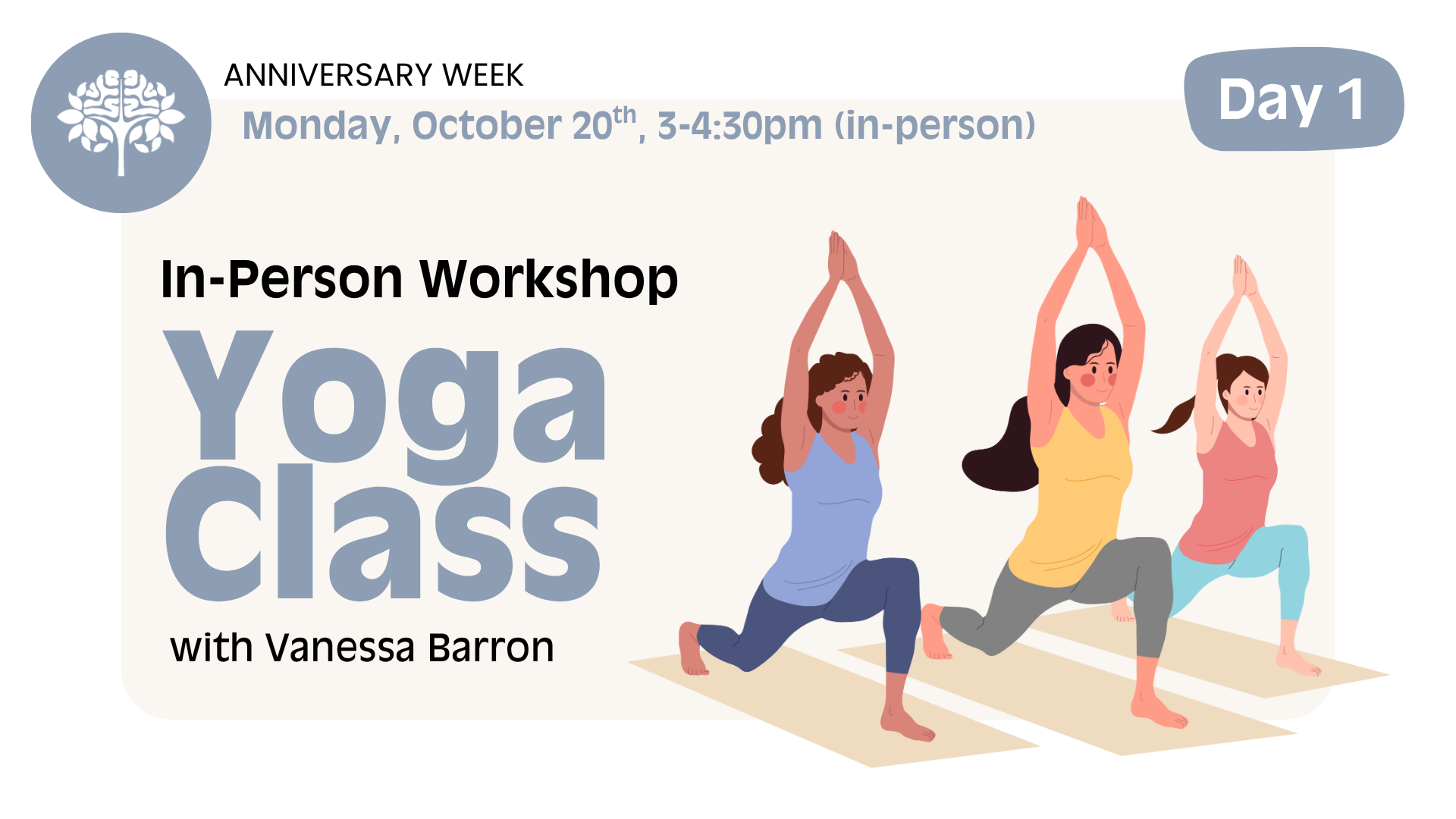We invite you to participate in an in-person yoga class with Vanessa Barron. The class will start with a short meditation and centering and move through a variety of poses from lying to sitting and standing. Yoga mats will be provided, but you are welcome to bring your own. This will be a prop-light class; however, feel free to bring your blocks or a folded towel/blanket if you use them regularly in your practice and know that you would like to modify some poses.