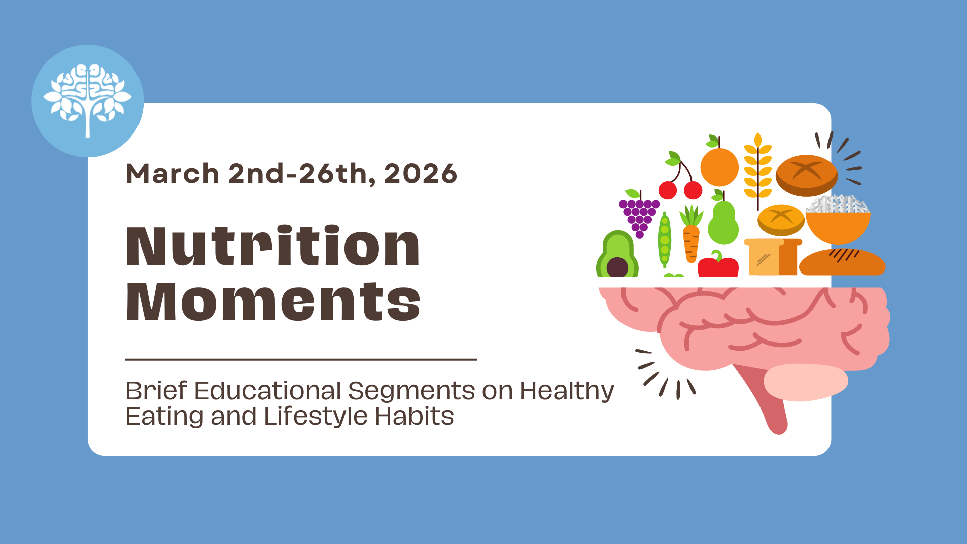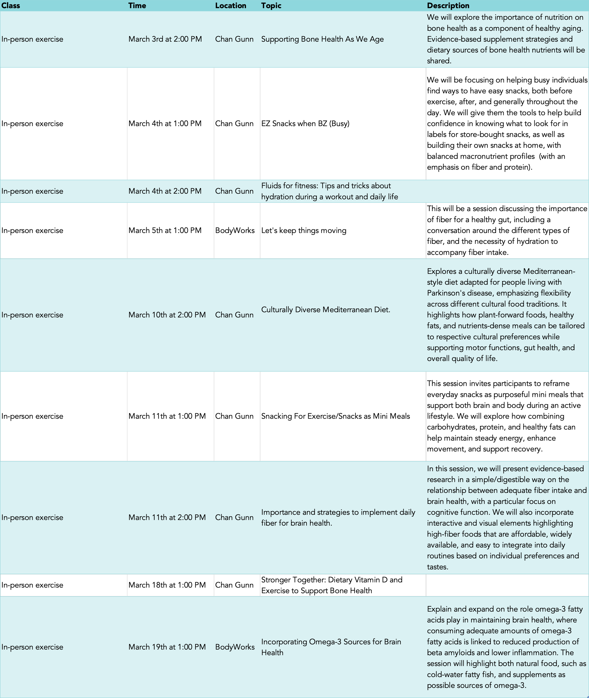"Nutrition Moments" are a collaboration between the BC Brain Wellness Program and UBC Dietetics. Here, small groups of dietetics students share key nutrition information and actionable tips at the start of our exercise classes. These brief educational segments cover various nutrition topics, providing quick insights into healthy eating and lifestyle habits. The spreadsheet below outlines the planned Nutrition Moment topic and corresponding online/in-person class. We welcome you to listen in and join for the exercise too!